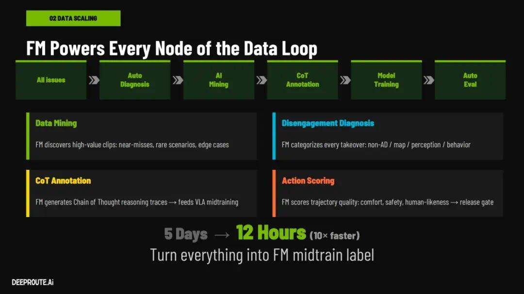 对此,元戎启行 CTO 曹通易给出了一组数据对比:原先一套的数据闭环跑下来,耗时超过 5 天,100 多个小时;但在引入 Foundation Model 之后,数据闭环的效率缩短到 12 小时。